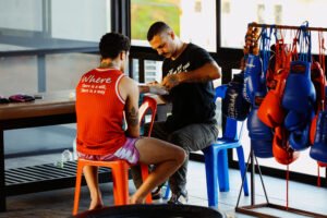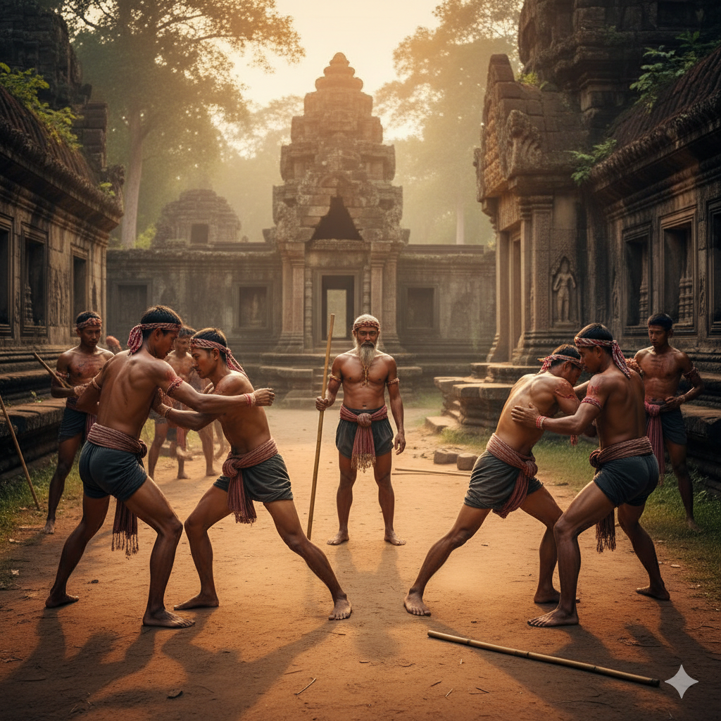Né des champs de bataille khmers, le Kun Khmer canalise une intention brute : frapper, briser, survivre. Frère — mais pas jumeau — du Muay Thai, il s’en distingue par un rythme plus tranchant, l’usage incisif des coudes et un clinch prédateur. Leurs ancêtres diffèrent : côté khmer, l’héritage du Bokator et des guerriers d’Angkor ; côté thaï, la lignée du Muay Boran. Les bas-reliefs d’Angkor en portent la trace, situant la tradition khmère en amont de la codification moderne. Découvre l’art originel qui forge un mental intraitable et un style sans compromis — et comprends pourquoi il transforme ceux qui l’étudient.